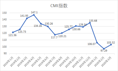 匠客工程機(jī)械數(shù)據(jù)顯示,2020年3月份中國(guó)工程機(jī)械市場(chǎng)指數(shù)即CMI為103.32,同比降低27.21%,環(huán)比提高6.20%(依據(jù)CMI判斷標(biāo)準(zhǔn),CMI降略高于衰退點(diǎn)100,市場(chǎng)短期仍受疫情影響,但下滑趨勢(shì)減弱)。
