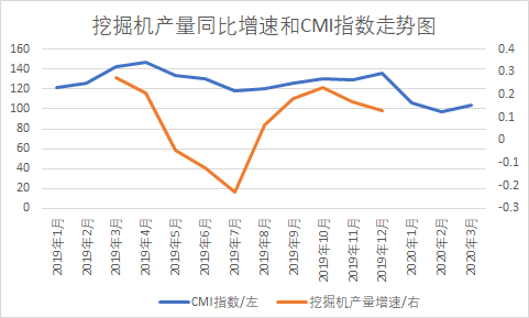對(duì)比挖掘機(jī)產(chǎn)量各月同比增速和CMI走勢(shì)來(lái)看,挖掘機(jī)產(chǎn)量同比增速和CMI指數(shù)走勢(shì)基本保持一致。2020年3月CMI指數(shù)環(huán)比有所回升,預(yù)計(jì)2020年3月挖掘機(jī)產(chǎn)量同比增速也將有所提高。