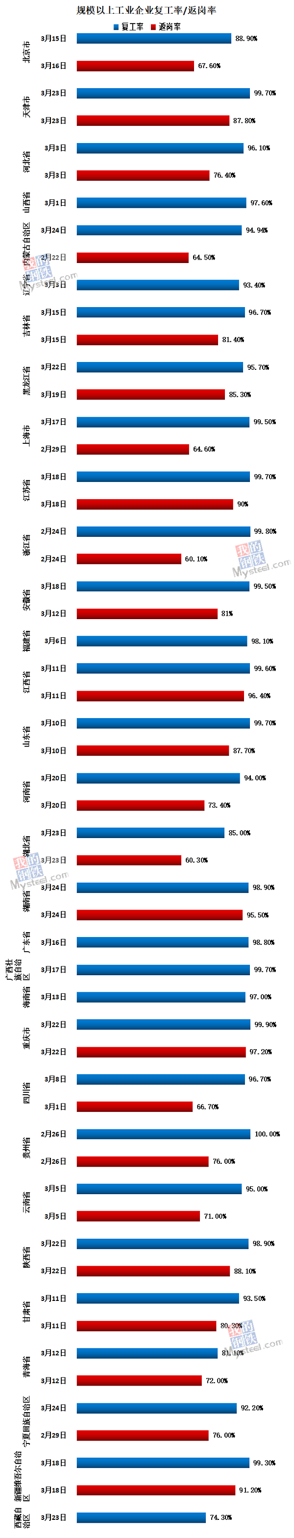 Mysteel統(tǒng)計(jì)數(shù)據(jù)顯示,截至3月26日,27省市規(guī)模以上工業(yè)企業(yè)復(fù)工率超過(guò)90%,江蘇、江西、湖南、重慶、新疆等省份人員返崗率超過(guò)90%。各地重大項(xiàng)目也陸續(xù)開(kāi)工。