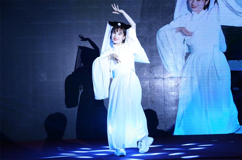 第九個(gè)節(jié)目是公司店慶舞蹈總指揮帶來的獨(dú)舞《白蛇傳說》,優(yōu)柔舞姿,翩翩入戲